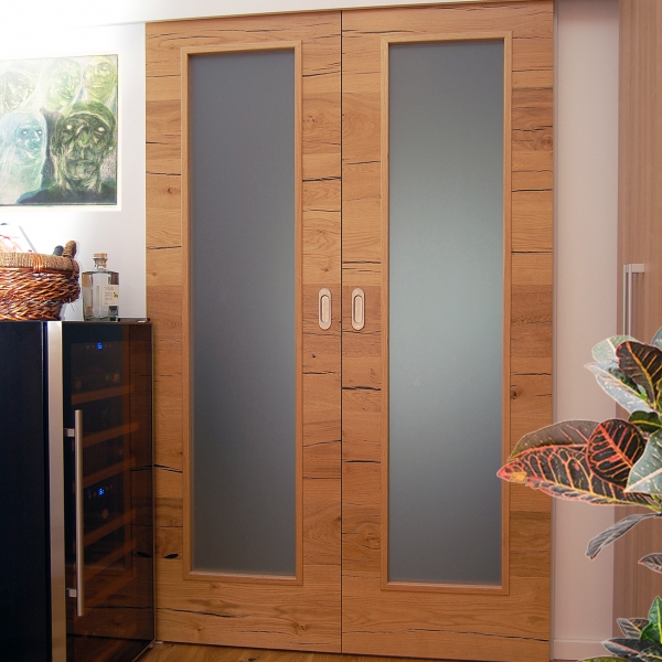 Výjimečná kombinace - dveře s povrchem dýha „praskaný dub“ a bíle lakované zárubně. Splnili jsme tak požadavek klienta a doplnili designový koncept interiéru domu.